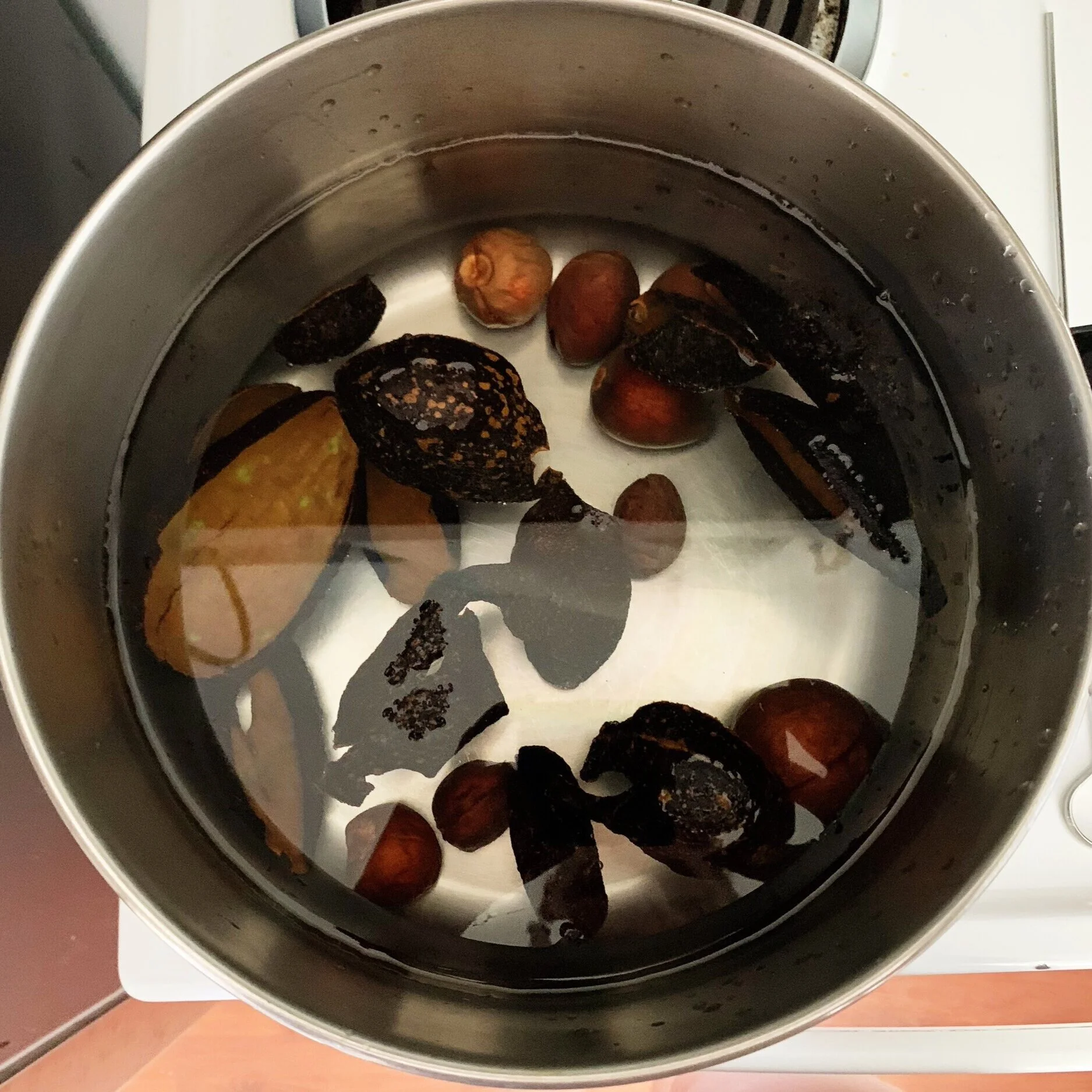 Once the dye has been extracted from the stones and skins to a hue that you like, you can place the fabric in the bath. I took out the skins and let the stones remain with the fabric. I soaked my fabric for 12 hours. Since I was worried about leaving the stove on while I slept, I just turned off the stove and placed a lid on the pot.